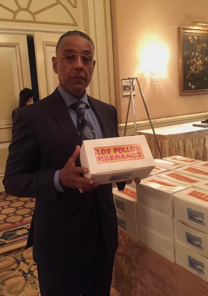 Giancarlo Esposito, o vilão Gustavo Fring em Breaking Bad que retornará para a terceira temporada de Better Call Saul, publicou uma foto no Twitter onde carrega caixas do restaurante Los Pollos Hermanos